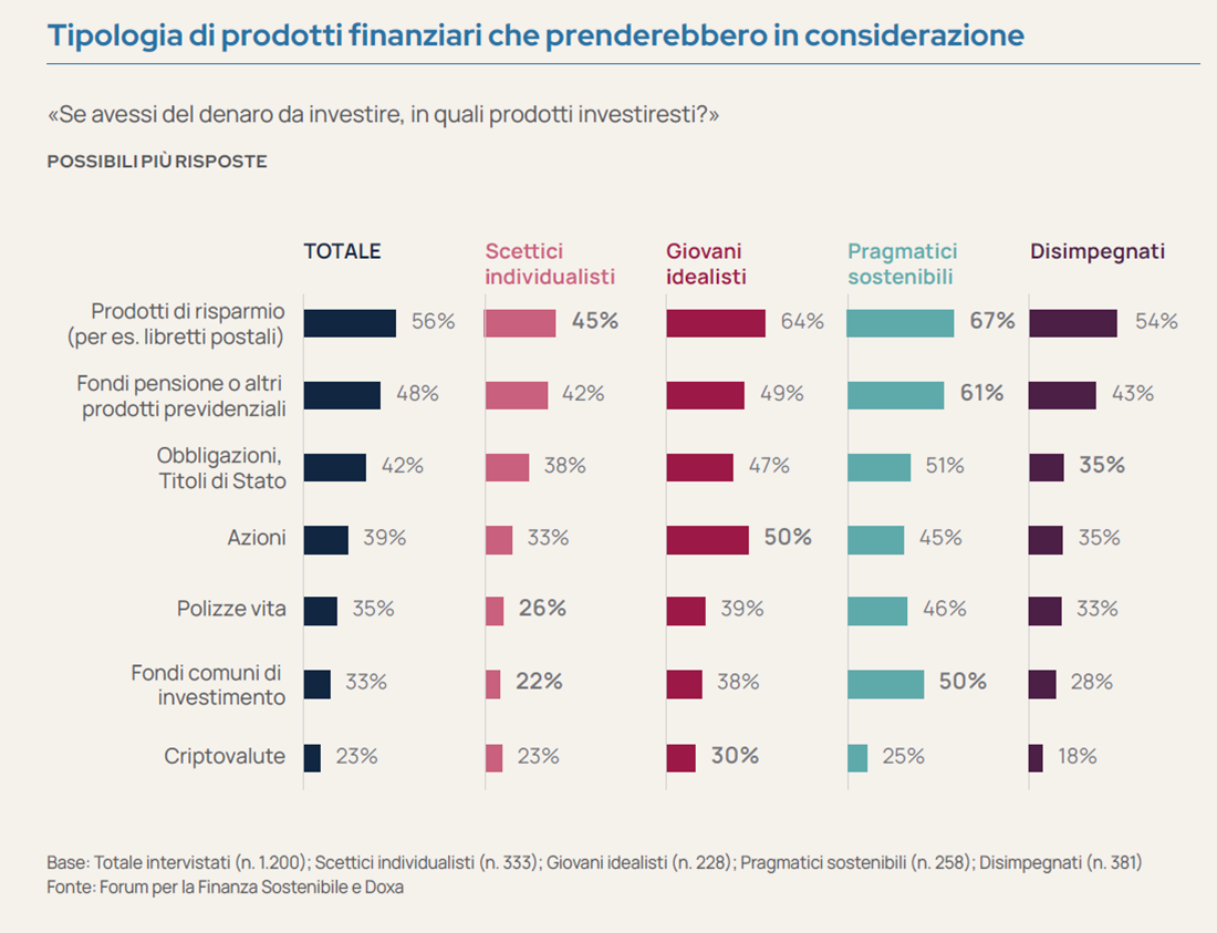 Con riferimento alla tipologia di strumenti finanziari, si investirebbe soprattutto in prodotti di risparmio, fondi pensione o altri prodotti previdenziali, obbligazioni e titoli di stato.