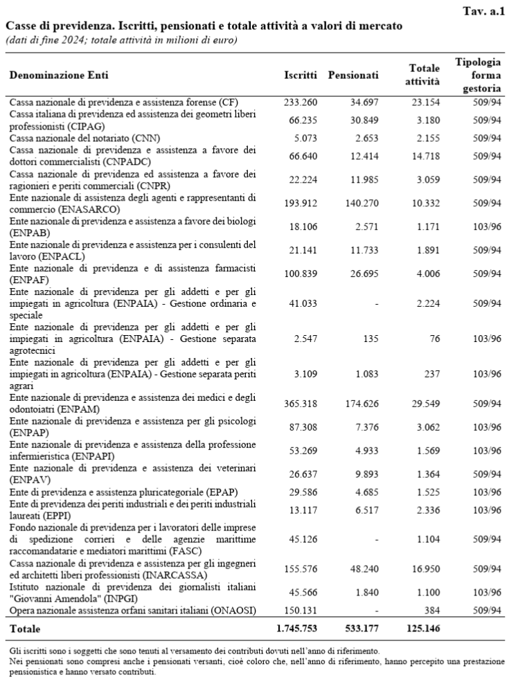 Nel 2024 si contano 1.745.753 iscritti e 533.177 pensionati, con un attivo totale di 125,1 miliardi di euro.