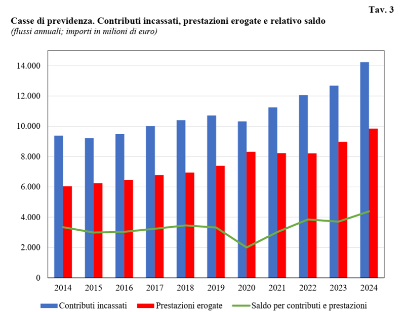 Negli ultimi 10 anni si è registrato un aumento sia dei contributi incassati (4,3% su base annua) sia delle prestazioni erogate (5% su base annua).