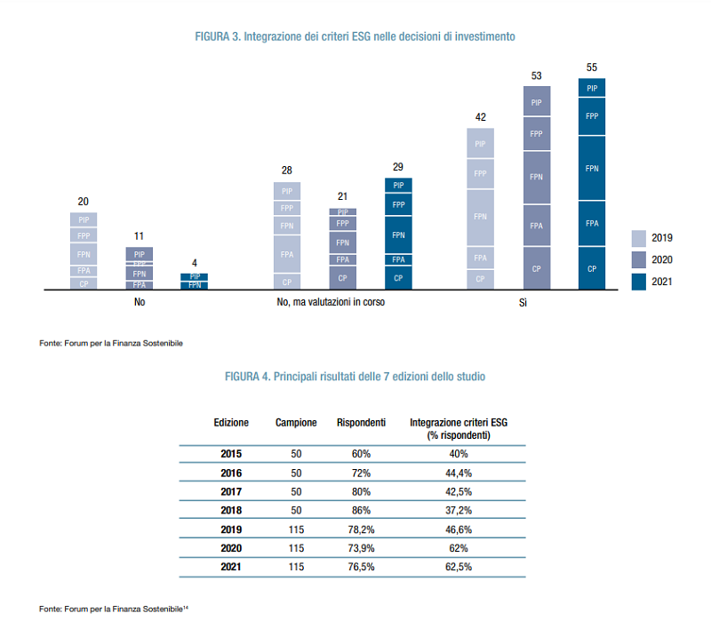 Fonte: Forum per la finanza sostenibile https://finanzasostenibile.it/wp-content/uploads/2021/11/Investitori-previdenziali-2021-Web.pdf