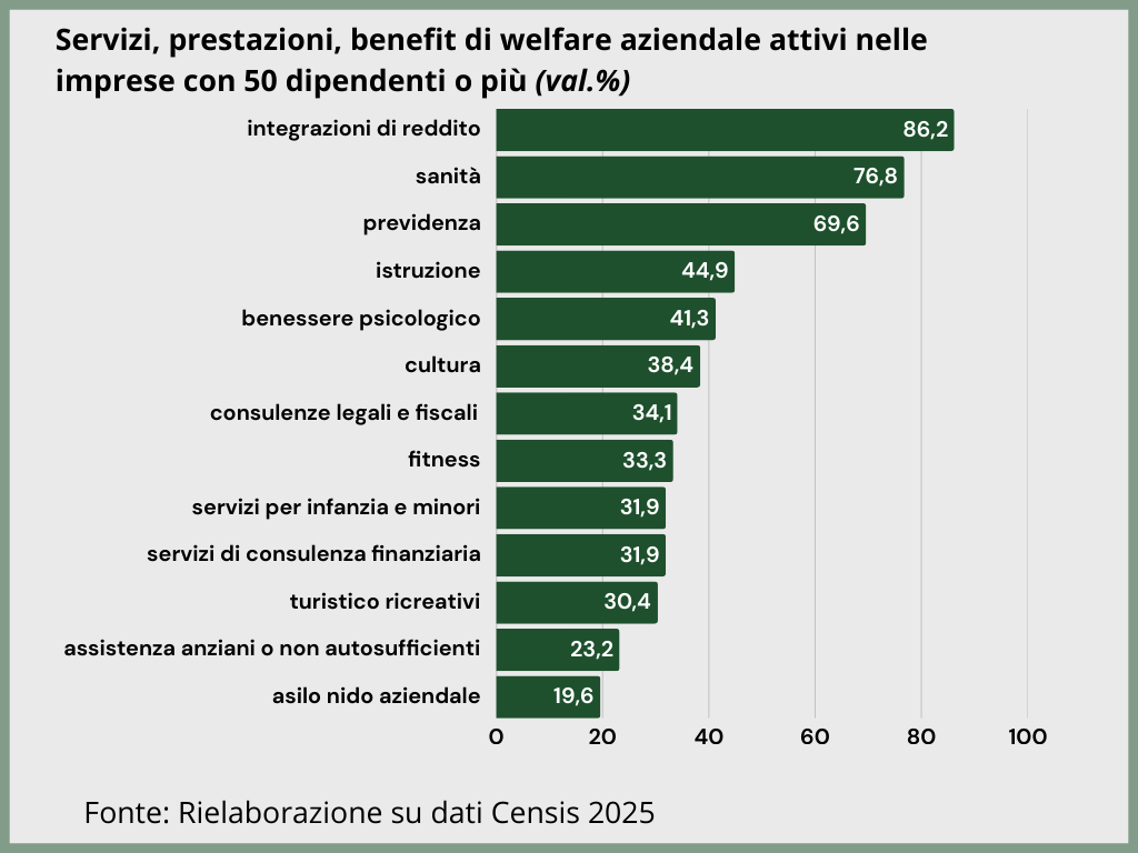 I servizi maggiormente diffusi tra le aziende riguardano formule di integrazione al reddito (buoni pasto, buoni carburante, buoni acquisto), polizze sanitarie, accesso a visite mediche specialistiche, check up medici annuali, previdenza complementare, supporto all’istruzione e alla formazione, assistenza per anziani o non autosufficienti, servizi per il benessere psicologico e per la salute mentale, servizi culturali (sconti per il teatro, cinema, concerti), fitness, consulenze specialistiche legali e fiscali.
